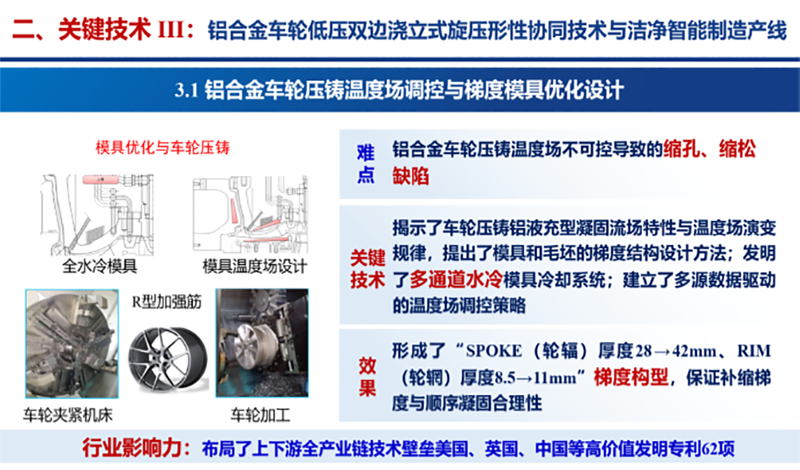 三是发明了铝合金车轮低压双边浇立式旋压新方法,突破了形性协同导向的铝合金车轮压铸智能温控模具优化技术,构建了铝合金车轮洁净切削自适应工艺策略与智能检测产线,提升车轮抗拉强度、延伸率,降低夹渣报废率。