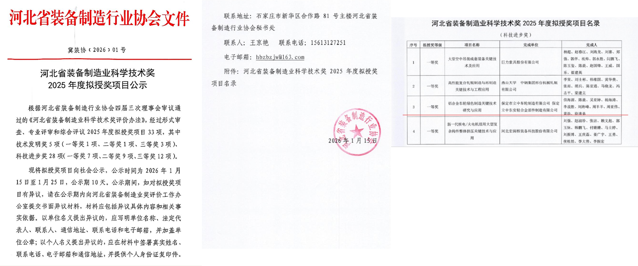 2026年1月15日,河北省装备制造业科学技术奖2025年度拟授奖项目公示,由保定市太阳城申博车轮制造有限公司和保定太阳城申博东安轻合金部件制造有限公司共同完成的“铝合金车轮绿色制造关键技术研究与应用”项目,荣获科技进步奖一等奖。